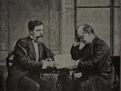 Bild: Der Begründer der Astrophysik und bekennende Spiritist, Johann K. Zöllner (1834 – 1882, rechts), führte Geisterbeschwörungen und paranormale Tests mit dem "Medium" Henry Slade (1836 – 1905) durch.