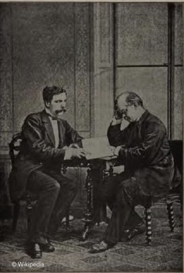 Bild: Der Begründer der Astrophysik und bekennende Spiritist, Johann K. Zöllner (1834 – 1882, rechts), führte Geisterbeschwörungen und paranormale Tests mit dem "Medium" Henry Slade (1836 – 1905) durch.