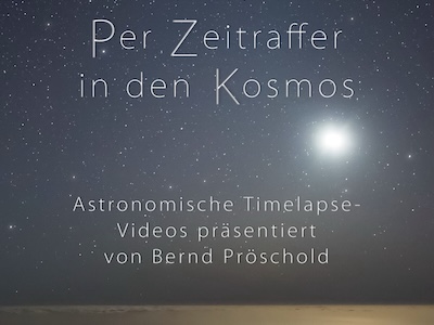 In seiner Multivision „Per Zeitraffer in den Kosmos“ zeigt der Astrofotograf Bernd Pröschold Timelapse-Videos vom Sternenhimmel und von Polarlichtern. Die Perspektive löst sich nach und nach von der Erde, bis schließlich die irdische Landschaft am Himmel rotiert und beim Betrachter ein Gefühl von Schwerelosigkeit hervorruft. Anhand seiner Motive erläutert Pröschold, wie eng unser Dasein auf Erden mit dem Geschehen im All verbunden ist. Außerdem berichtet er von den teils widrigen Bedingungen, unter denen seine Aufnahmen entstanden sind.